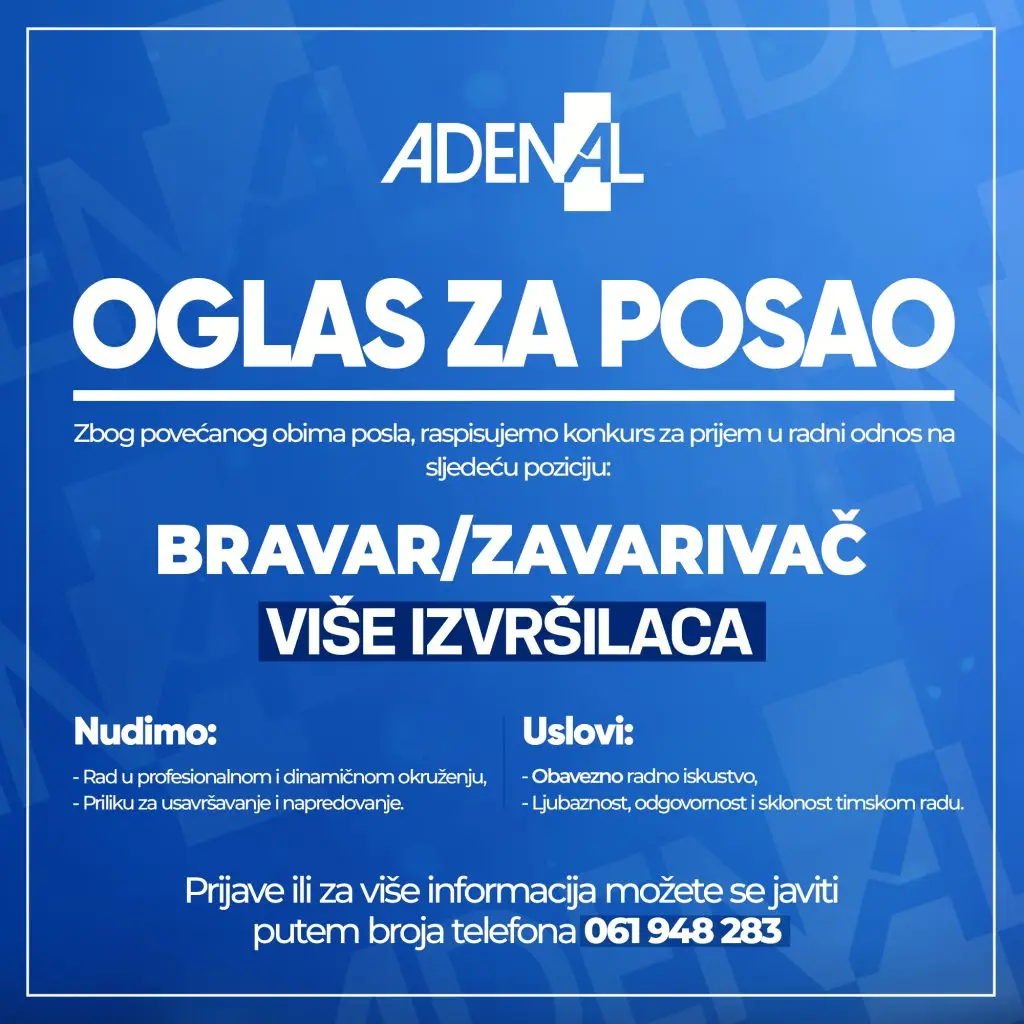 Adenal d.o.o. zbog povećanog obima posla raspisuje konkurs za prijem radnika na sljedeću poziciju: