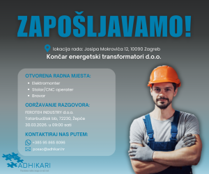 Hrvatska agencija Adhikari d.o.o. za renomiranu kompaniju Končar – Energetski transformatori iz Zagreba zapošljava elektromontere, stolare, CNC operatere i bravare.