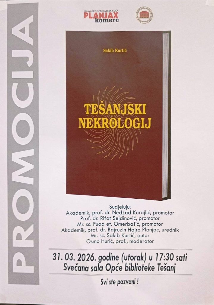 Čast nam je pozvati vas na promociju knjige TEŠANJSKI NEKROLOGIJ, autora mr. sci. Sakiba Kurtića, u izdanju Izdavačko-štamparske kuće PLANJAX komerc, koja će se održati 31.03.2026. (utorak) u organizaciji Opće biblioteke Tešanj u Svečanoj sali biblioteke u 17:30 sati.